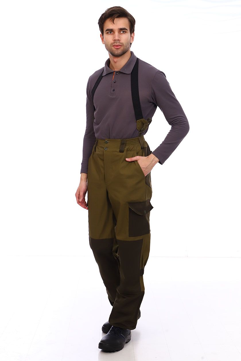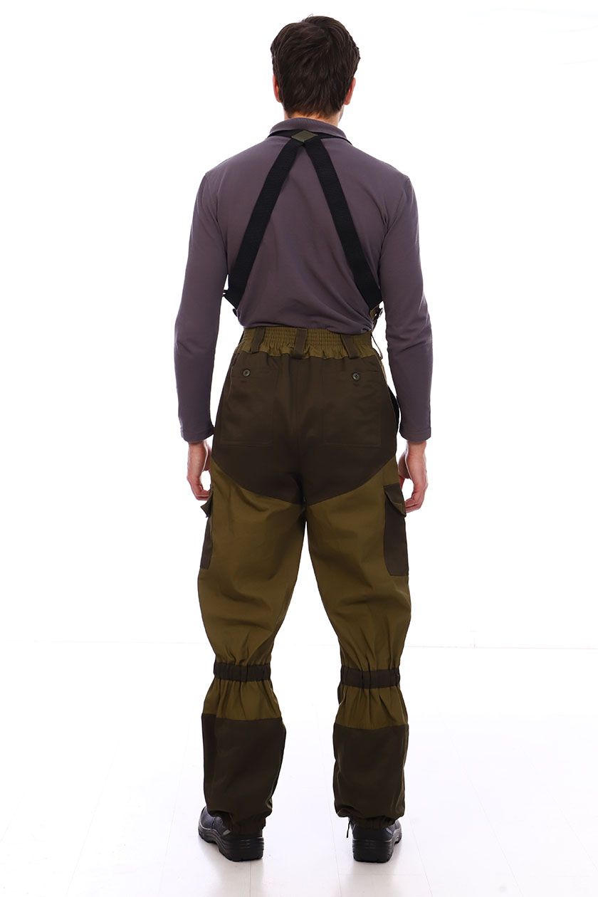 ➠ Брюки с поясом на эластичной тесьме, застегиваются на пуговицы с супатной застежкой гульфика. Бретели на резинке крепятся к брюкам на пуговицы. По линии колена кулиски стянутые эластичной тесьмой, по бокам в области колена накладные карманы с клапанами застегивающиеся на пуговицу.