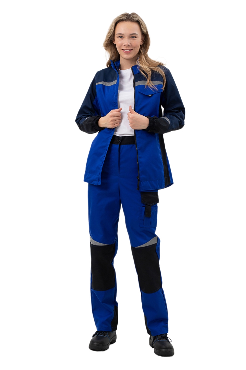 ➠ Брюки с застежкой на молнию, с притачным поясом, стянутым резинкой в области боковых швов для лучшей посадки на фигуре, пояс со шлёвками. Застежка пояса на пуговицу. Брюки с боковыми карманами с наклонной линией входа, с наколенниками и усилениями по шаговому шву. На задней половинке брюк фигурный накладной карман. На боковом шве брюк расположен накладной многофункциональный карман с фигурным клапаном и застежкой на липучку. Костюм со светоотражающими фигурными полосами для лучшей видимости в темное время суток.