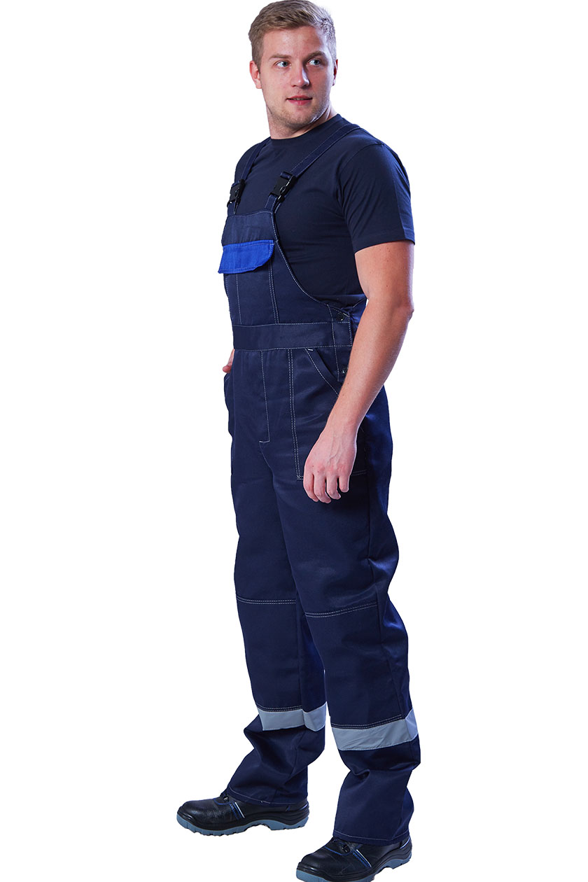 ➠ Полукомбинезон с застежкой гульфика на тесьму «молния» и застежкой в правом боковом шве на пуговицы. Два накладных кармана с наклонным входом. В области коленей усилительные накладки. На правой задней половинке накладной карман. На грудке накладной карман с клапаном. По низу брюк СОП 50 мм.